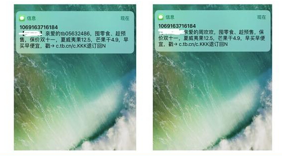 大家看下下图的两条短信,短信大部分内容相同,那么哪一条会更加容易一瞬间引起我的兴趣呢?